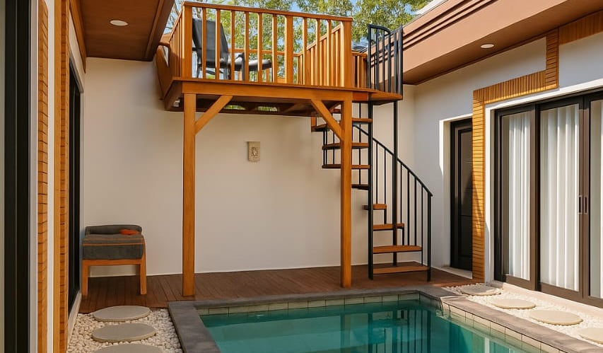 Premium ironwood flooring throughout all indoor and outdoor areas